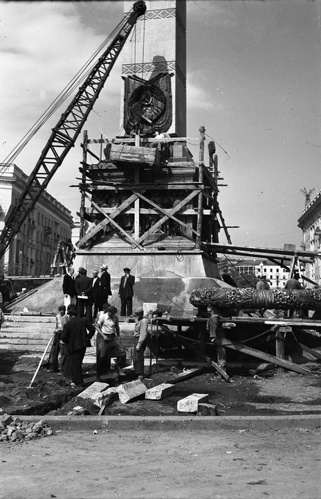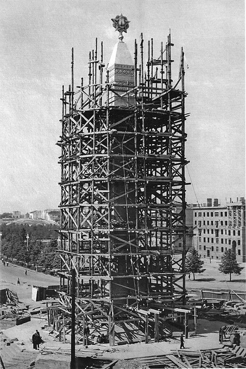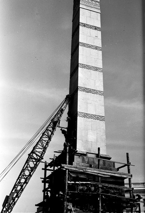 Сохранились снимки обелиска, окруженного строительными лесами, за 1953 год. Один из них снят со стороны улицы Захарова, другой — со стороны Киселева.