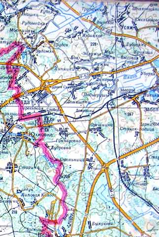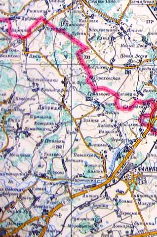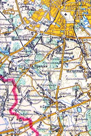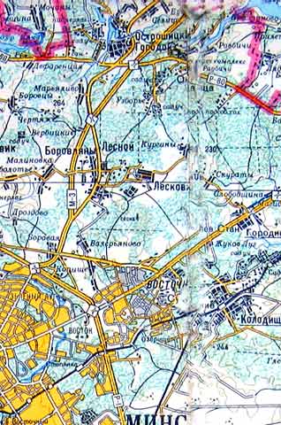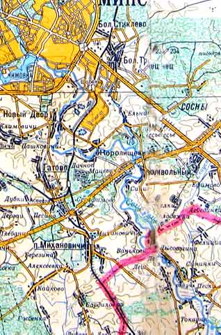 Взяли цифровик и засняли небольшой фрагмент, но повреждения на карте были настолько существенны, что даже Фотошоп был бессилен - в районе надписи МИНСК проходила вертикальная практически черная полоса... И тем не менее, если то что из этого получилось окажется Вам полезным, мы не будем считать потерянными несколько часов, отнятых у нас на подготовку этой странички...